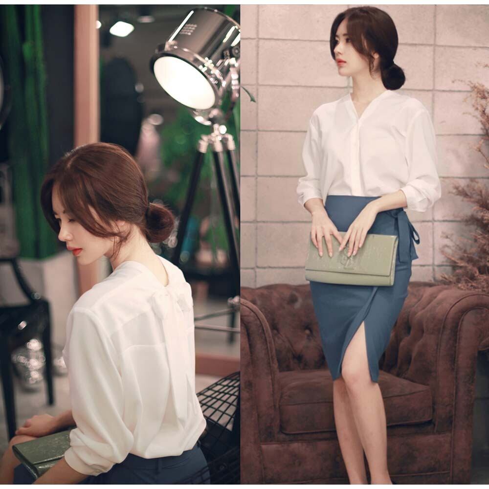 vネック スキッパーシャツ ブラウス 長袖 バックリボン リバーシブル