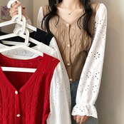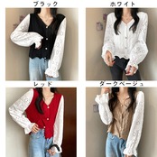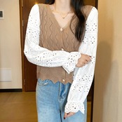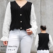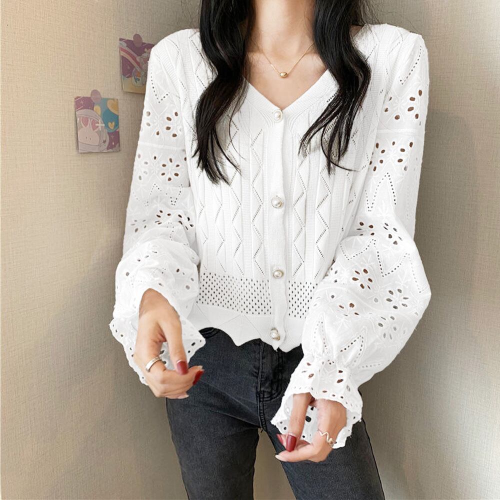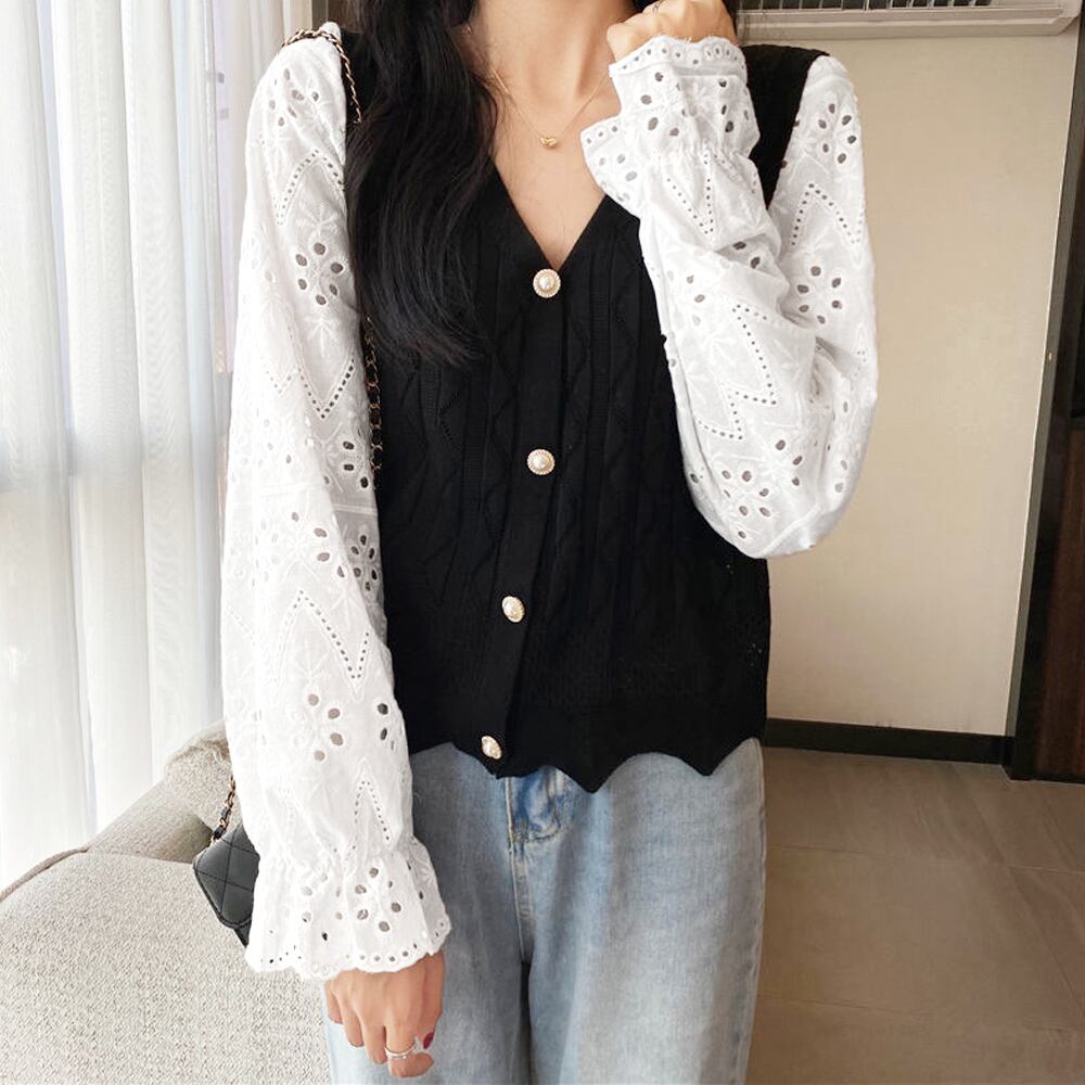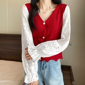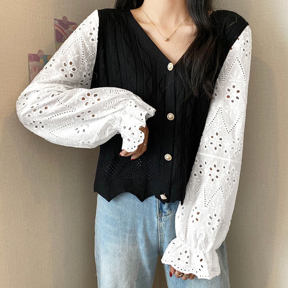 ブラウス ドッキングニット 袖切り替え レース長袖 Vネック 韓国風 ニットソー セクシー きれいめ パールボタン